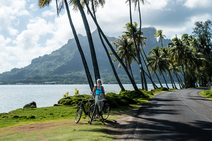 Off with the swimming suits and onto rented bicycles (with fat tires, coaster brakes, and no gears)! Bora Bora’s 32-kilometre coast road hugs the shoreline almost all the way around the island, and it’s an ideal half-day cycling trip. Great scenery, with the jagged peaks of an extinct volcano dominating the landscape. Traffic is light and respectful; pigs, slow-moving dogs, smiling Polynesian tots, coconuts, and pot holes were the only obstacles on this mostly-paved, mostly-flat road. Thirty-two kilometres doesn’t sound like much, but we were sure glad to get back to the tender dock, where Oceania staff were handing out cold water and lemonade.