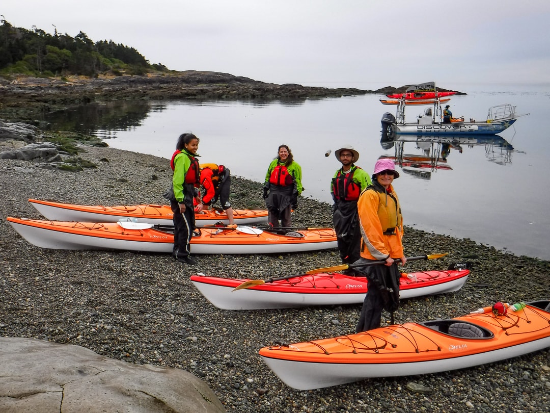 Guides Jordie and Seth from Ocean River Adventures made this an informative, safe, and relaxed-pace trip. On arriving at Discovery Island, Jordie and Seth unloaded the kayaks and helped us onto the water, without even getting our feet wet. The current was favourable, so we were able to circumnavigate Chatham and Discovery Islands before stopping on a driftwood-strewn beach for lunch.