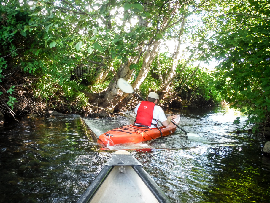 “When you end up in the bushes, stay low, and don’t lean,” instructs Charlie, as he briefs us – twice – before we enter the River of Golden Dreams, the twisty five-kilometre stretch of moving water that connects Alta Lake to Green Lake. Nathan skippers a solo kayak, while the rest of us are partnered in tandem canoes.