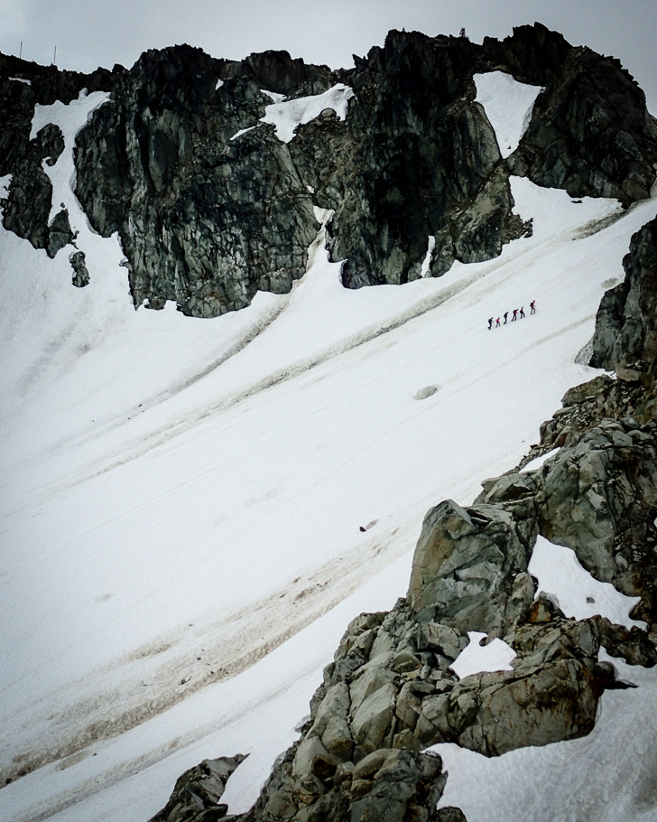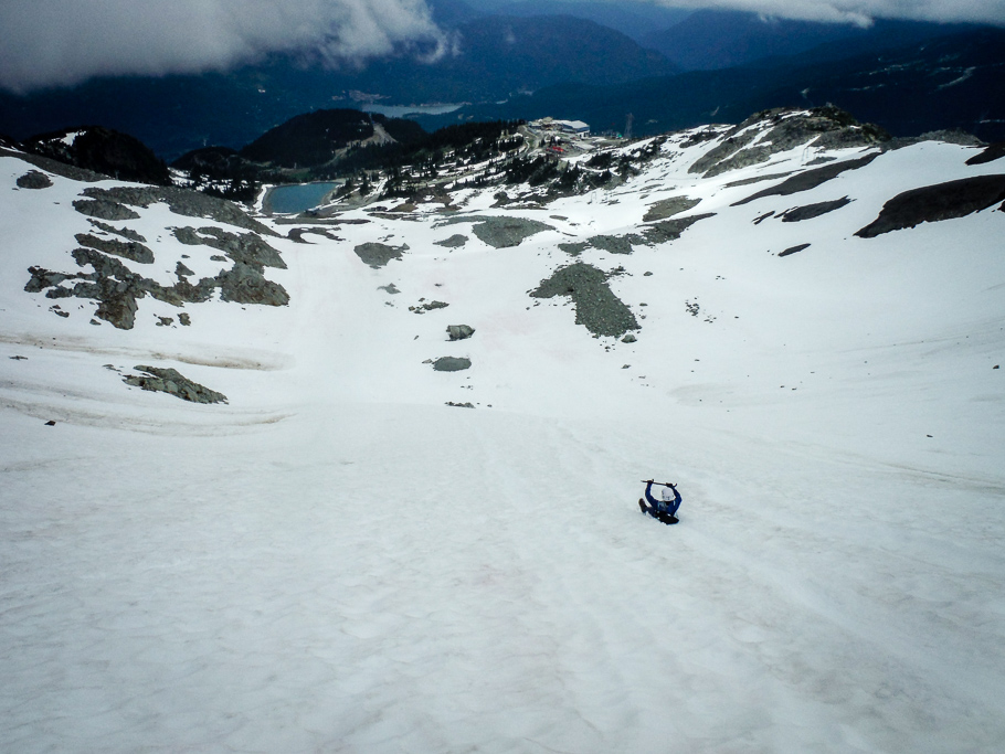 Oscar leads us on a short-roped ascent across glacial snow and ice into the Whistler Bowl. We learn about glaciology and how to ascend a glacier around crevasses like a real mountaineer. Oscar shows us sun cups (bowl-shaped depressions in a snow surface), watermelon snow (the red colour is caused by a cold-loving algae, and yes, it does smell like watermelon), and erratics (rocks transported by glacial ice).