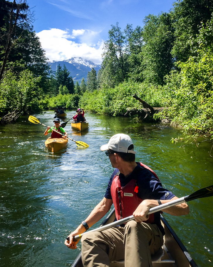 A few of our boats execute unintentional 360-degree turns and other ballet moves, but no one capsizes. Along the route we see lush wetlands, old-growth forest, beaver dams, and plenty of birds. Not surprising, paddling this little waterway is Doug and Cathy’s favourite Whistler activity, because paddling is what we do. Scarlett names the River of Golden Dreams as a favourite, too, perhaps because of the merganser families and lily pads.