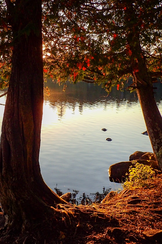 A beaver cheers us on our last night. He (or she) glides by, swimming with great purpose towards a clump of sticks. Beavers have a lot to do in autumn, in preparation for the coming winter. Doug feels a special attachment to beavers. In elementary school, he wrote a paper titled Our Friend, Castor Canadensis Michiganensis. We still have the paper, and yes, he got an A+ grade.