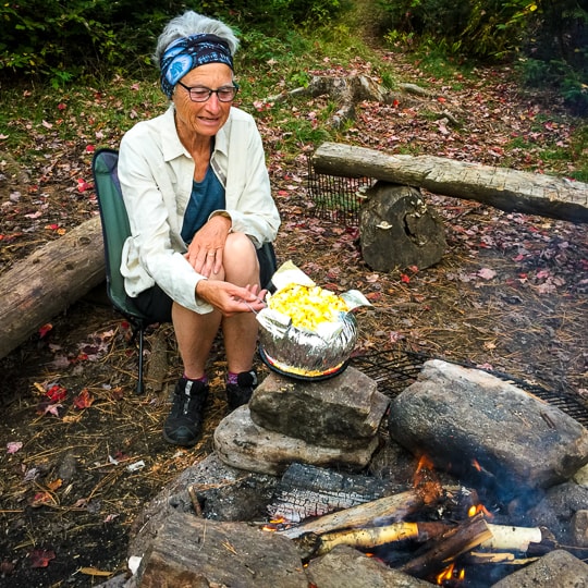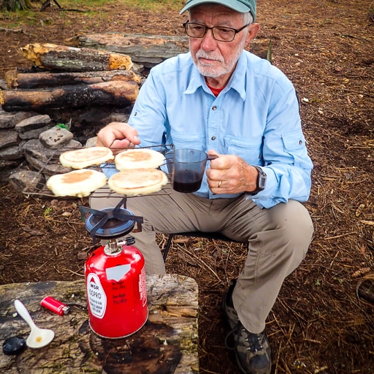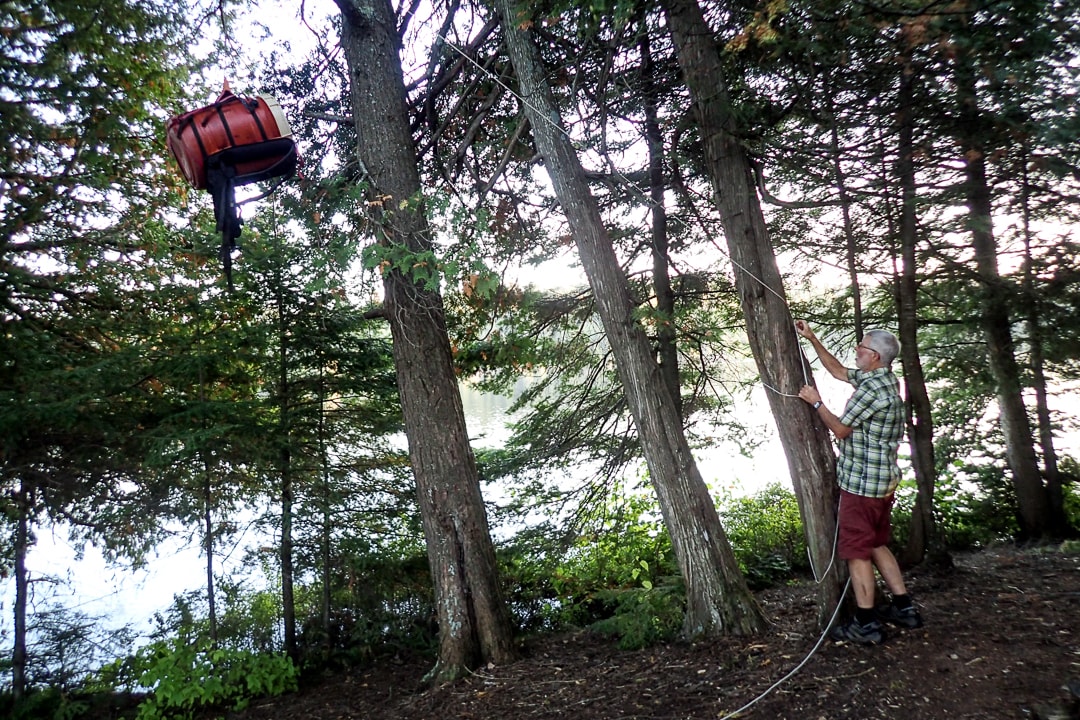 One tent pole is broken, and one of the air mattresses has a leak. We notice these problems on night one, but by mid-trip the tent pole is completely shot, and the air mattress is useless. No repair kits – just a small roll of plastic tape – but Doug is up to this real-world engineering challenge! Using a rock, he breaks the pole and shortens it. The tent has a lop-sided look, but it gets us through. He finds the mattress leak; the tape is not a proper patch, but the mattress now holds air for an hour or two. Doug’s next challenge: refining his food-hanging skills.