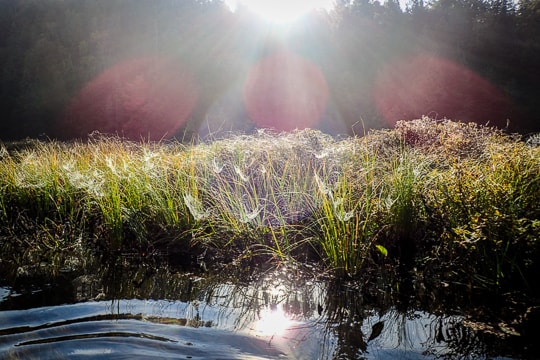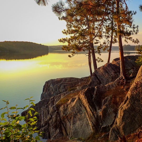 Bog plants decorated with spider webs, spunky frogs on the trail, and a family of loons are sighted as we navigate McIntosh Marsh, Grassy Bay, and into White Trout Lake, where we find a lovely island campsite. Islands have squirrels, but fewer chipmunks; perhaps chipmunks can’t swim?
