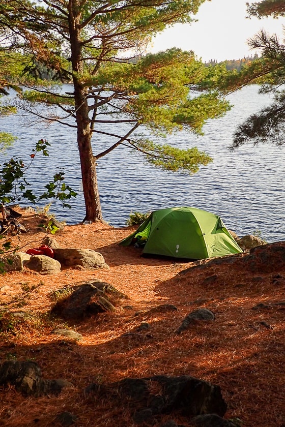 Night one we camp on Tom Thomson Lake, sharing our site with an extremely bold chipmunk. It rains hard all night, but the rented tent doesn’t leak, and we won’t need our rain gear again for the duration of the trip.