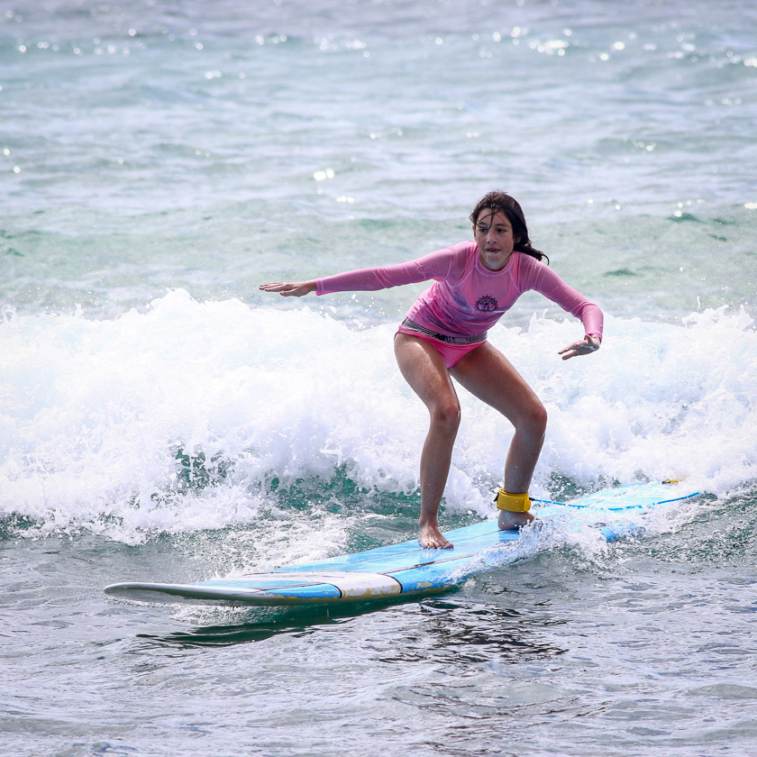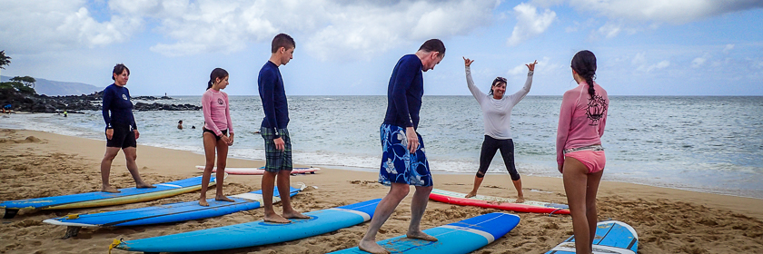 First up is a two-hour lesson on surfing, “Hawaii’s gift to the world.” North Shore Surf Girls specialize in beginner surfing lessons, and they do a great job. All of our participants stand up and ride waves during their lesson. It’s thrilling, but it’s hard work, resulting in sore arms and cut feet.