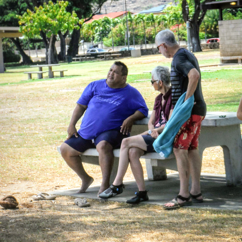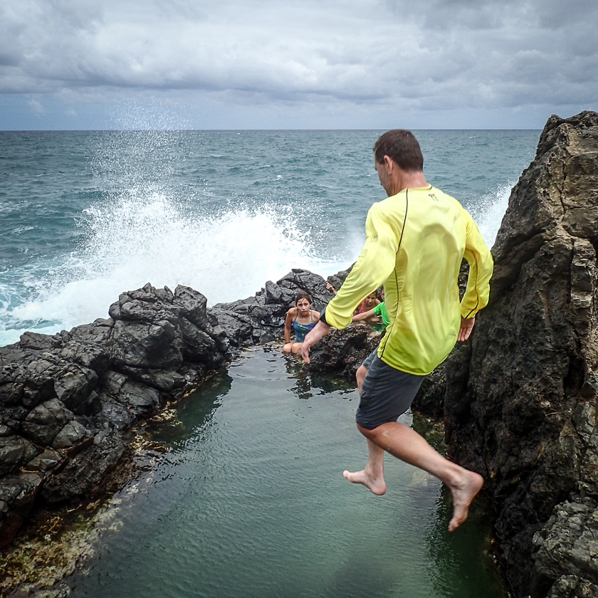 We spend an hour or so on Mokulua, enjoying the scenery and jumping into a tide pool. Standing on the beach, Doug and Nathan are almost wiped out by a solo kayaker who is tossed out of control by a big wave. “See why it’s best to go with a guide?” says Simeon, and we agree.