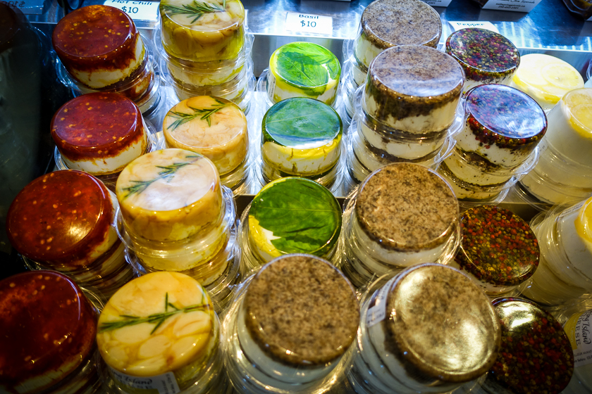 About two kilometres from Fulford Harbour we make a little detour to The Salt Spring Island Cheese Company set in the woods. We see the goats, watch through viewing windows as fresh goat cheese is being made, then head into the shop to taste some samples from the cheese menu. We buy a container of Ruckles, a soft goat cheese with herbs and fresh garlic in grape seed oil. Laughing Apple Farm comes next, and here we buy a bag of luscious prune plums.