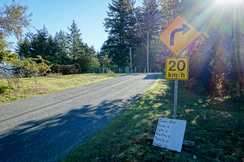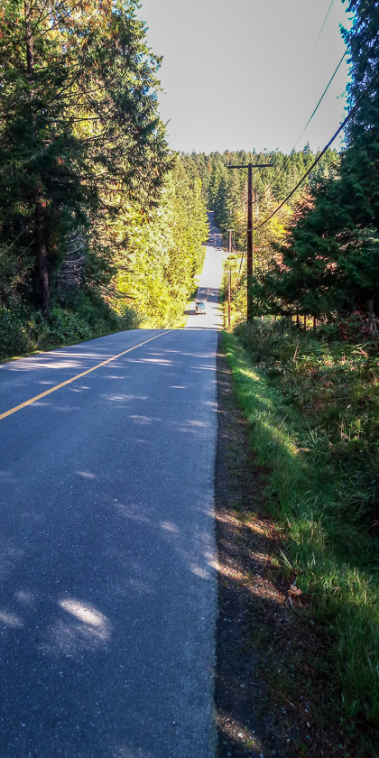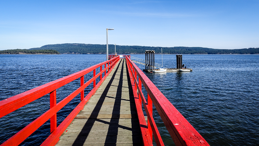 Day four we re-trace our lower island route along Beddis, Stewart, and Beaver Point roads. Signed “bike route,” these roads are quieter and prettier than the Fulford-Ganges Road. Waiting for the ferry, we sit in the sunshine, sipping coffee and chatting with two cyclists who have ridden down from Comox. One of them tells us he has cycled the Pacific Marine Circle three times; we add this to our wish-list.