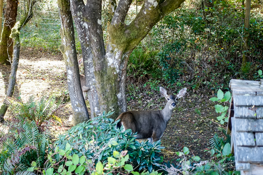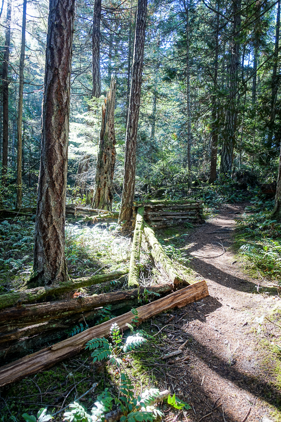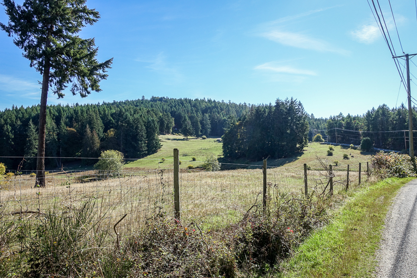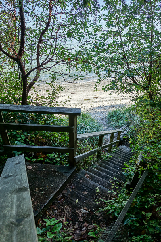 Day three we brave North End Road once more, then head down the west shore along Sunset Drive to Vesuvius Bay. Near the northern tip is an access point for the Jack Foster Trail, which runs through the woods, past moss-covered fences, and down a set of wooden stairs to a rocky beach with a view of Wallace Island’s Chivers Point, where we have camped so many times.