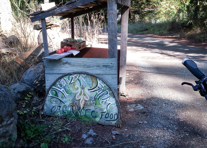The next day we tackle the hilly Walker Hook loop, which heads north on the eastern shoreline, then returns inland via St. Mary Lake. Watercolour artist Carole Evans painted Shoreline at Walker Hook. We have one of the limited editions prints, a gift from Doug’s brother Steve, so Walker Hook is a special place for us. Continuing north, we come to Fernwood Wharf, then the Hudson Point boat ramp, where we have launched our canoe for numerous trips to Wallace Island and beyond. Turning inland, North End Road is much less bicycle-friendly, with narrow or non-existent shoulders and some super-fast drivers, but the Phoenix farm stand has tart, crisp apples.