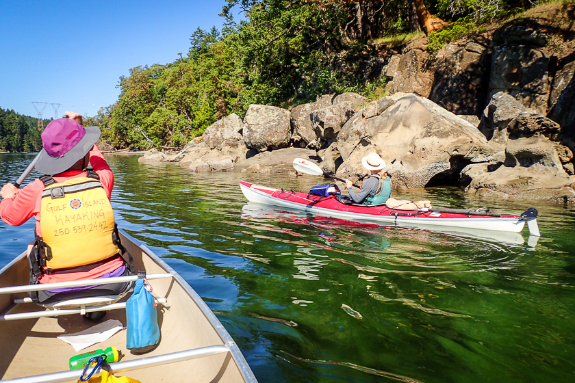 We sign waiver forms and collect PFDs in preparation for our Experience Galiano Day Tour with Gulf Island Kayaking. Cathy spies a Clipper canoe tied to the dock. May we take the canoe instead of a kayak? Chessi says yes. It’s a calm day, we are the only guests, and probably he doesn’t like to disappoint us old folks, for whom the canoe is clearly the boat of choice. Skyllar, our knowledgeable guide, loves her solo kayak; à chacun son goût!