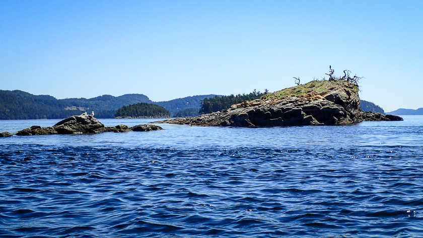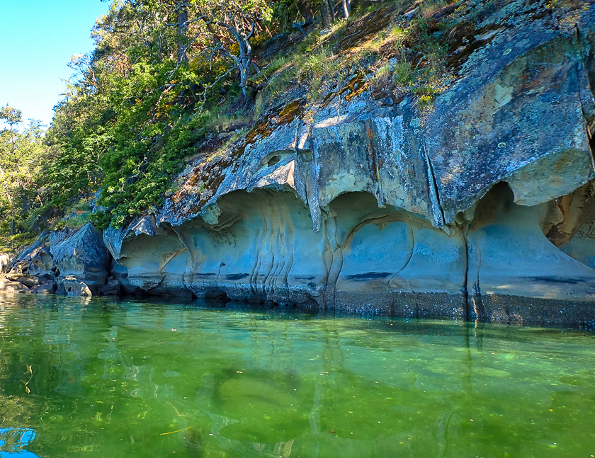 Skyllar leads us on a well-designed route that explores the islands and the cliffs of Galiano. We see sculpted sandstone (tafoni formations), a cormorant colony, otters, eagles, seals, and lots of intertidal life. It’s an informative tour, and Doug’s smartphone says we covered a respectable 20 km on the water.