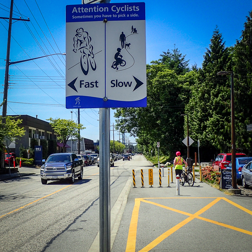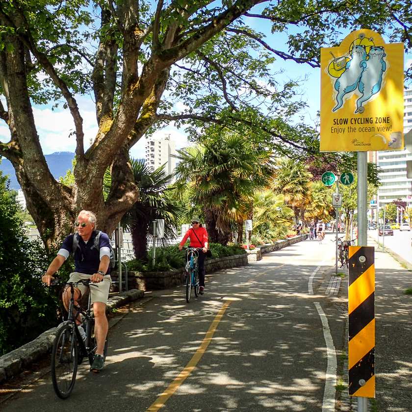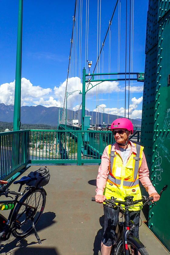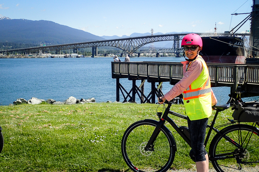 “Nobody’s gonna miss you.” Cathy hears that once or twice each day this week. High-vis jacket, traffic safety vest, bright pink helmet: not an uncommon outfit in Victoria, but out of place here in Vancouver, where cyclists all seem to be young and fashionably dressed. Another difference we observe: fewer e-bikes and fewer hills.