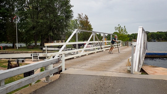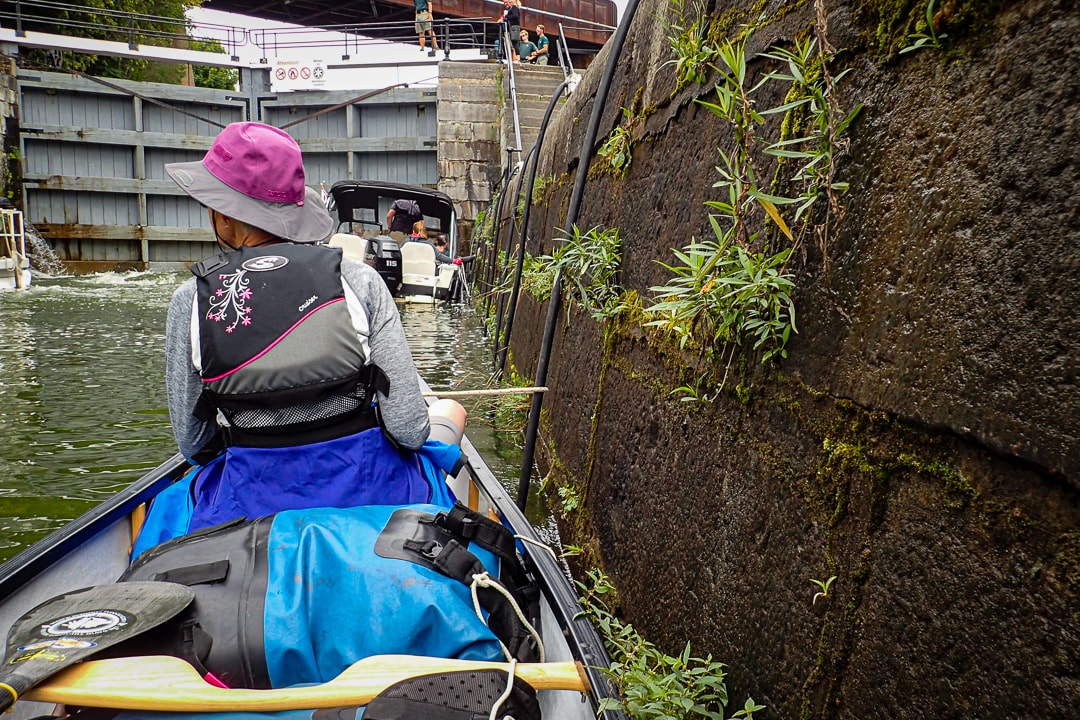 To make the Rideau more accessible to paddlers, Parks Canada offers a fifty percent discount on seasonal lockage permits for canoes and kayaks ($4.40 per foot, which is $70.40 for a 16-foot canoe), and paddling docks have been installed at the lockstations. These lower platforms are handy for kayakers, who often have trouble getting in and out of their kayaks at the regular mooring walls. Us, we prefer the regular moorings, because we like their sturdy cleats and bollards, but we use the paddling docks to show our appreciation for Parks Canada’s thought.