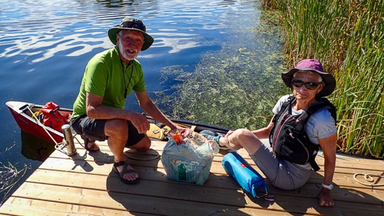 “That’s what we do in Perth,” says the kind fellow who drives Doug to Canadian Tire for a bottle of camp stove fuel, because he thinks it’s too far for us old folks to walk. “Would you like a coffee?” a young man asks, as we wait on the blue line at Black Rapids. Coffee gratefully received, he brings us a bag of bagels and a plate of fruit and cheese. His family picnic is wrapping up, and he’s happy to share. “Hello! Hello! You are welcome to rest at our dock!” a cottager calls to us on a very windy day. We are fine, making slow but steady progress into the wind, but we are touched at her concern for us.