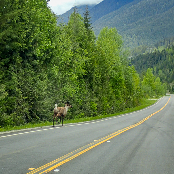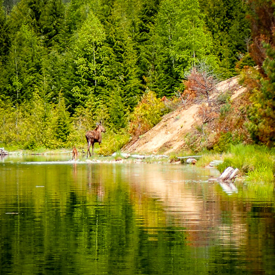 One endangered mountain caribou, one mule deer, two black bears – and that was just on the three-hour drive along Highway 23N to Mica Dam, where the road abruptly ends. Amy, our outfitter, yields to the wildlife, provides stories and advice, and stops for a photo op at Goldstream Falls before dropping us, our gear, and one of her rental canoes at a wetland access road between Mica Dam and Mica Creek, the living quarters for Dam personnel.