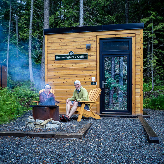 At Revelstoke Campground (formerly a KOA), the Basic Camping Cabin is more rustic (that means more spiders) than the MicrOCube, but the Cabin is larger and has a covered porch, handy for cooking in the rain. In Nelson, we move up a notch by taking a renovated suite at Kokanee Glacier Resort, giving us our own little kitchen and bathroom.