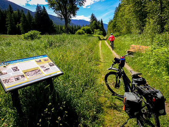 What a lovely ride! A 50-kilometre, level trail for non-motorized recreation, beautifully maintained by volunteers, with benches, picnic tables, interpretive signs, and toilets along the way. To our Victoria friends, imagine the Galloping Goose Trail, except with more grass, fewer people, and more impressive scenery.