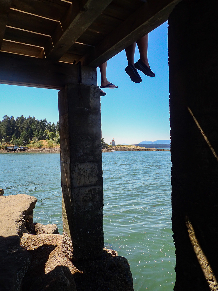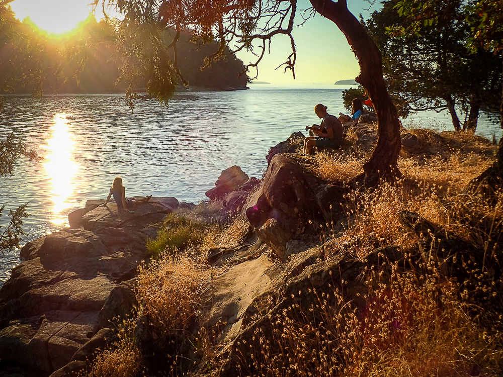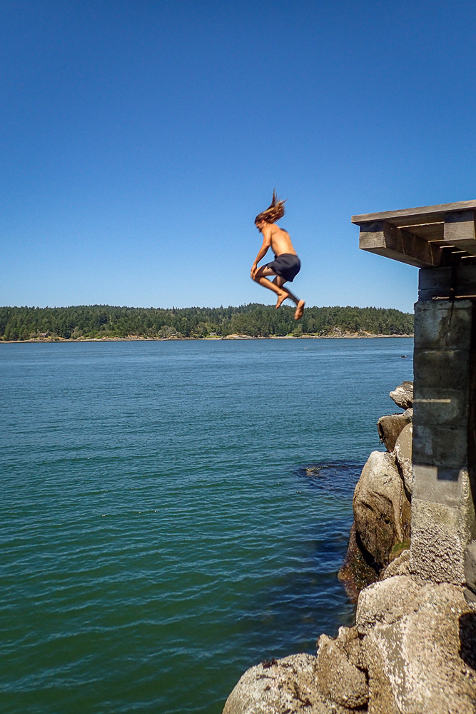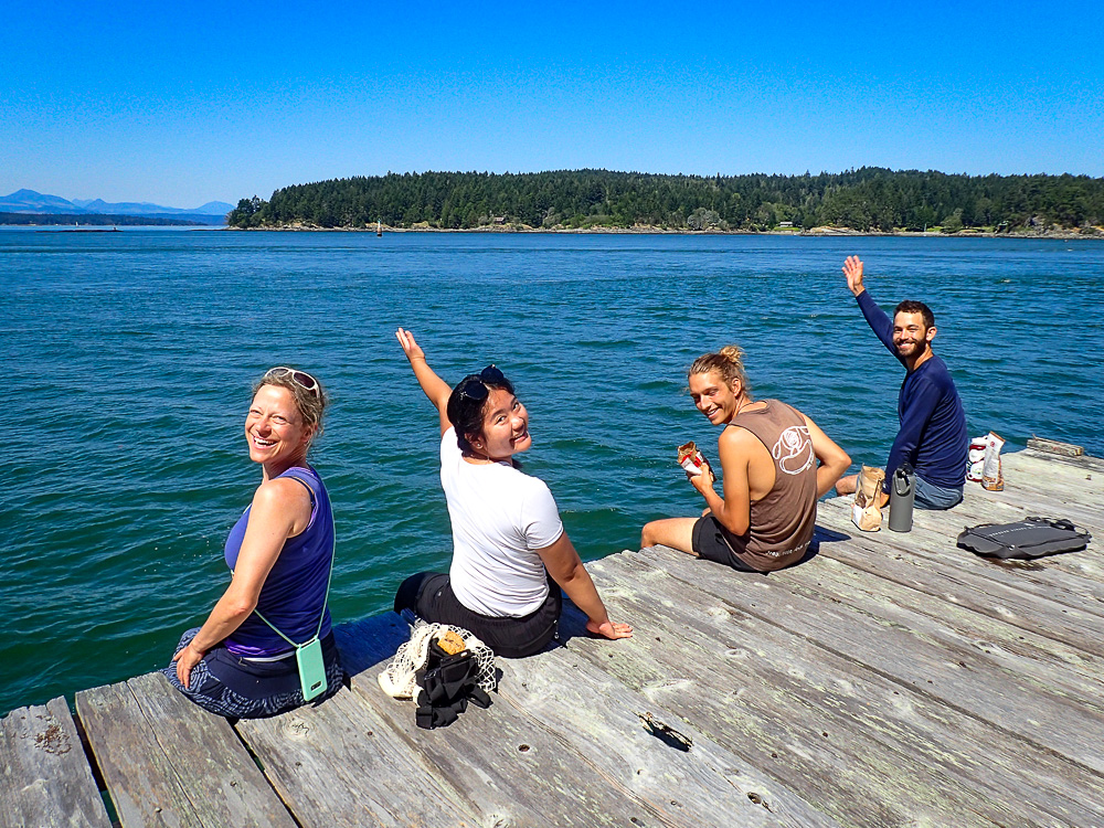 Day three brings options: an all-day paddle to Blackberry Point and back, chilling out at the sandy beach or hiking the park’s numerous trails through the forest and along the shoreline. After considering the heat wave and everyone’s wishes and energy levels, we agree on a modest group hike: three hours to wander the Raymond V. Smith Interpretive, Maple Bay, and Porlier Pass Trails, with a stop to watch Lukas leap from a dock. We spend the rest of our day enjoying our Helinox chairs, while Wyatt gets a lesson in rolling a kayak.