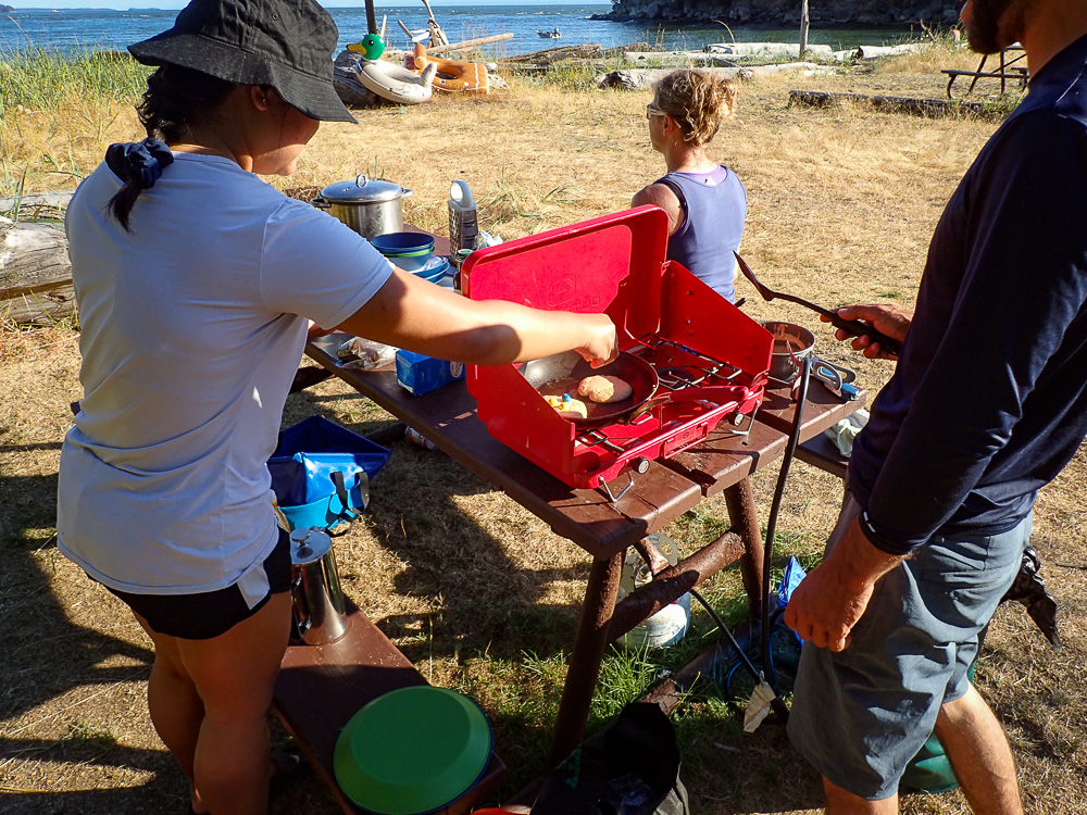 Lead guide Lukas brings his guitar and his home-grown lettuce, and guide Wyatt contributes stand-up comedy and his imitation of a baby seal. Guests Svenja and Carmela pack cheerfulness, kindness, and a sense of adventure. We bring our Helinox chairs. This small but congenial multi-generational group launches from Hudson Point on Salt Spring Island on Friday, July 29.