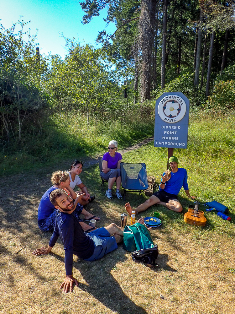 Dionisio Point has at least thirty backcountry campsites in two separate camping areas. We pitch our tents in the upland Parry Lagoon campground, which is closer to the beach and the water pump (boil water advisory in effect). Sandstone Campground has a kayak rack, but water access is challenging because the landing is on a sloping rock ledge exposed to the Strait of Georgia. Cyclists like this campground, though, and it is completely full when we arrive.