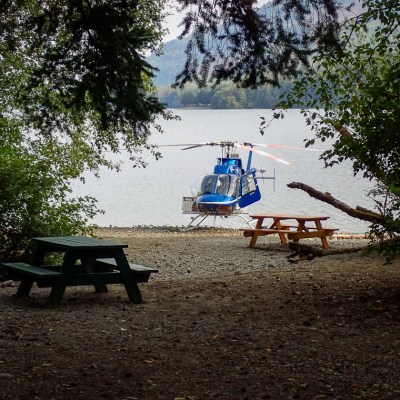 A raccoon and park operator Cloe welcome us to Maple Grove Recreation Site. “I’ve never seen anyone arrive by canoe,” says Cloe. A few cyclists, a few hikers, yes, but most campers arrive in pickup trucks or RVs, having travelled the gravel road maintained by the timber companies that hold the land surrounding the lake. Having paddled in, we think we are special until the next day when we see an arrival at Heather Campground’s site 13D – by helicopter.