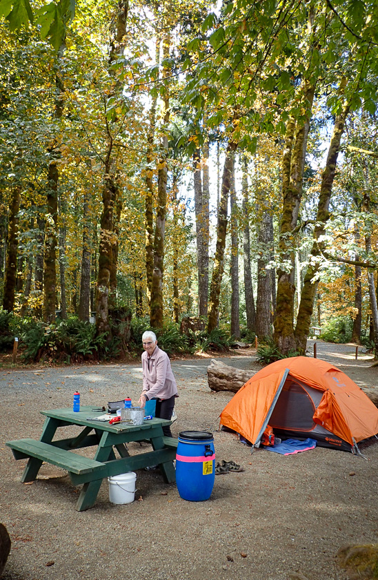 Friday is our most adventurous day. We paddle past a mama elk and her two calves. For three hours we cautiously ride the steep waves in a following sea. Caycuse Recreation Site is not where it’s shown on the tourist map, but eventually we find it. We land in the surf and grab the last unreserved beachfront campsite. The campground host tracks campers’ addresses, and we are surprised to learn that campers come from afar (the Lower Mainland, even Europe) to this backroad location.
