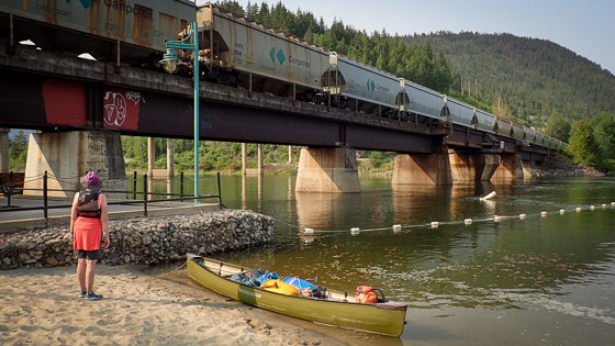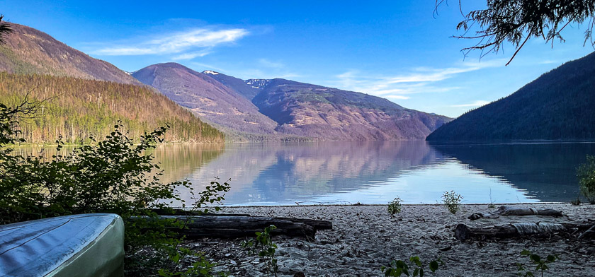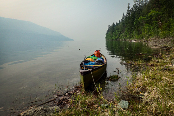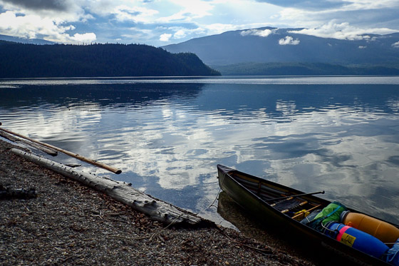 An interesting shape, Shuswap Lake, and it’s known as Houseboat Heaven. For two weeks we cruise the top half of the addled H in our boat of choice, a 17-foot canoe. Cycling the Okanagan Rail Trail, viewing peak water levels on the Adams River, and hiking the Joffre Lakes Trail are land-based activities before and after our Shuswap Lake canoe trip.