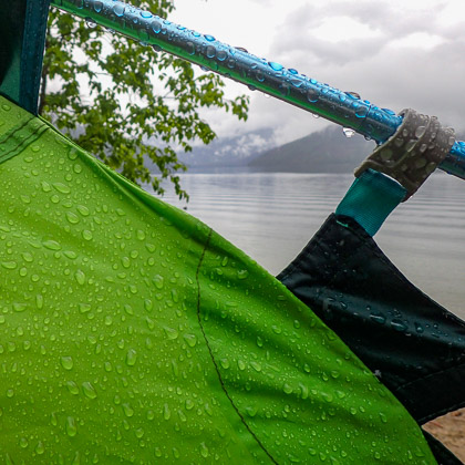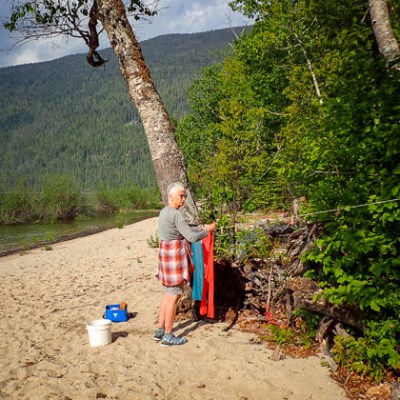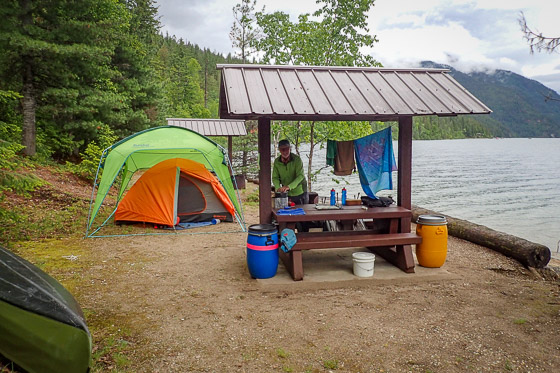 “I wish it would rain,” sighs Doug, and boy, does his wish come true. Torrential rain causes us to shelter in our tent at Anstey View campsite for two entire days and nights. Cell phone service is surprisingly good on Shuswap Lake, so at least we know what weather to expect, and week two brings perfect paddling conditions.