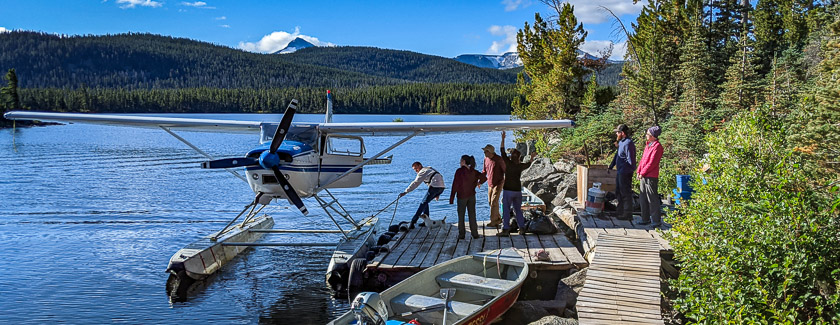 A gaggle of staff, volunteers, and guests wave us welcome as our floatplane approaches the dock on the shore of Whitton Lake, at the southeast edge of Tweedsmuir, BC’s largest provincial park. From their website photos, we recognize the Erel Bucovetsky family, including the family dog Tashi. The guests are the ones enjoying a quick swim in the lake after a day of hiking in the mountains. The multinational volunteers add a youthful energy to the group.
